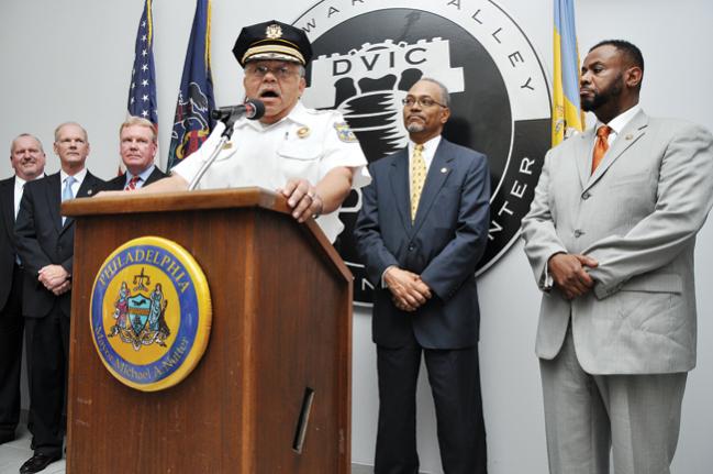 IntelligenceCenter_070413 Published on April 6, 2014 in Officials: Philadelphia’s “All-Hazards” Fusion Center Did Not Monitor Train Derailment, Oil SpillFull resolution (649 × 431) < Previous Next > Philadelphia Police Commissioner Charles Ramsey (center) at DVIC press conference on the facility’s opening day. Photo: Philadelphia Police Department