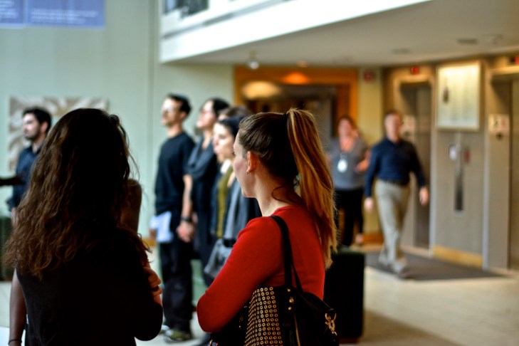 JVP-Onlookers Published on August 9, 2014 in Jewish Voice for Peace Protesters Occupy Lobby, Demand End to Israeli Siege of GazaFull resolution (3000 × 2000) < Previous Building employees pause to watch the six protesters. (Photo: Joshua Albert)