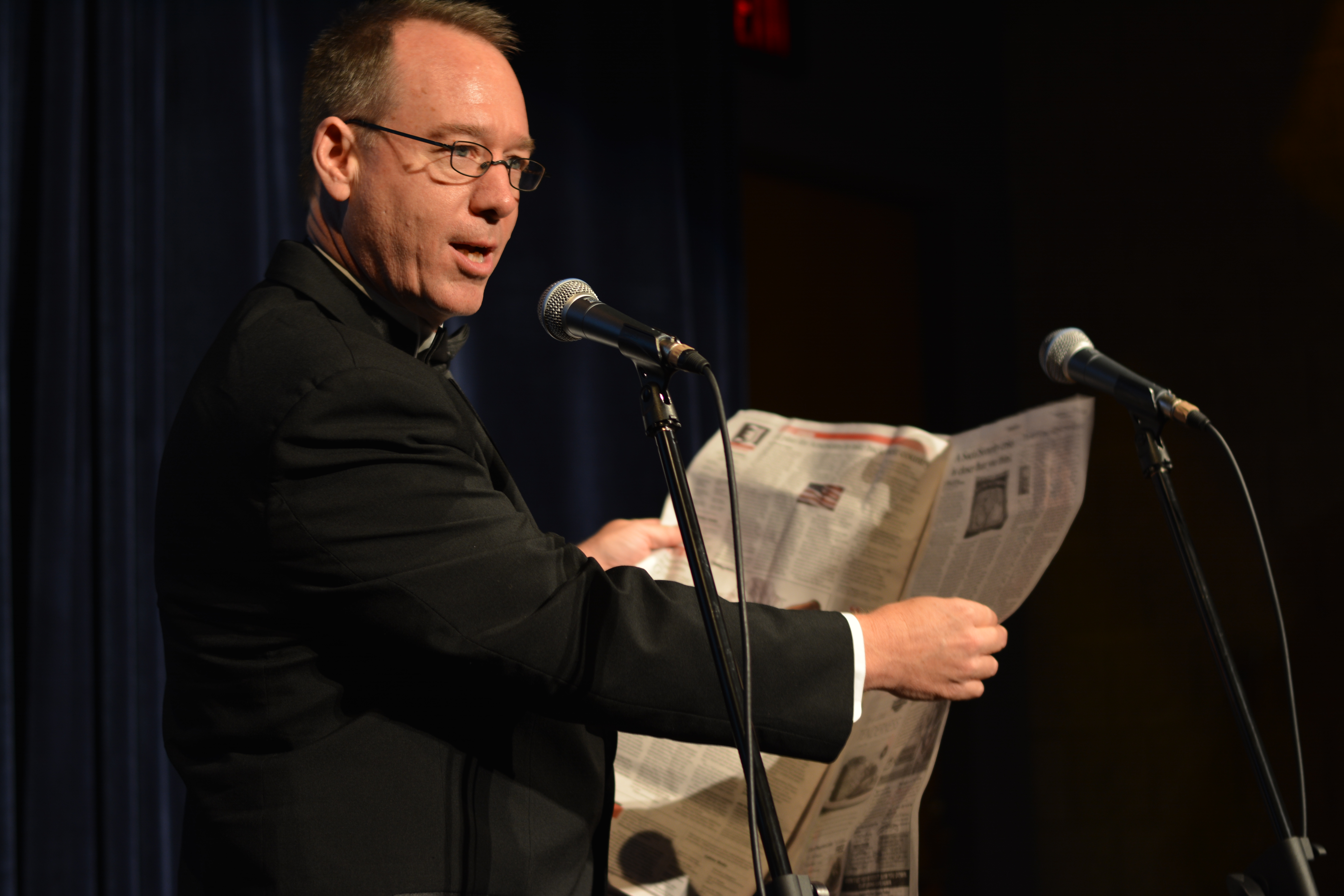 hodgpaper Published on August 17, 2014 in Philly Geek Awards: “Mysterious” Black Guy is 2014 Geek of the YearFull resolution (6000 × 4000) < Previous Next > Joel Hodgson demonstrates how to boot up a newspaper. Photo by Kenneth Lipp