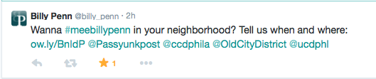 Screen Shot 2014-09-11 at 4.19.12 PM Published on September 11, 2014 in Opinion: Philly news startup Billy Penn smartly wants to visit your neighborhoodFull resolution (529 × 111) < Previous Next > Photo: @Billy_Penn’s Twitter account