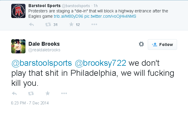 asshole Published on December 7, 2014 in “We Will Fucking Kill You”: Online Ire from Some Eagles Fans Over Tonight’s Planned ‘Die-In’Full resolution (635 × 390) < Previous Next >