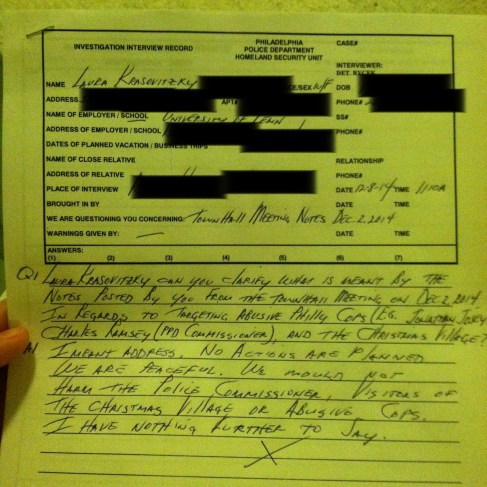HSUinterview Published on December 12, 2014 in Penn Student Questioned at Her Dorm by Philly PD Homeland Security over #FergusonPHL PostsFull resolution (1936 × 1936) < Previous “Interview Record” from the Philly Police Homeland Security Unit