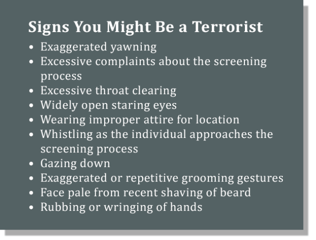 Signs-of-Terror Published on June 6, 2015 in Ahead of Pope and DNC Events, Philly Police Training Under Criticized SPOT Counter-Terrorism ProgramFull resolution (649 × 494) < Previous Next > Graphic: The Intercept