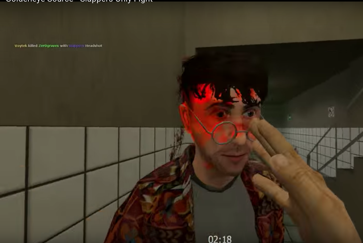 A screenshot from the “Slappers Only” multiplayer mode of GoldenEye 007, released in 1997 for the Nintendo 64 home console.