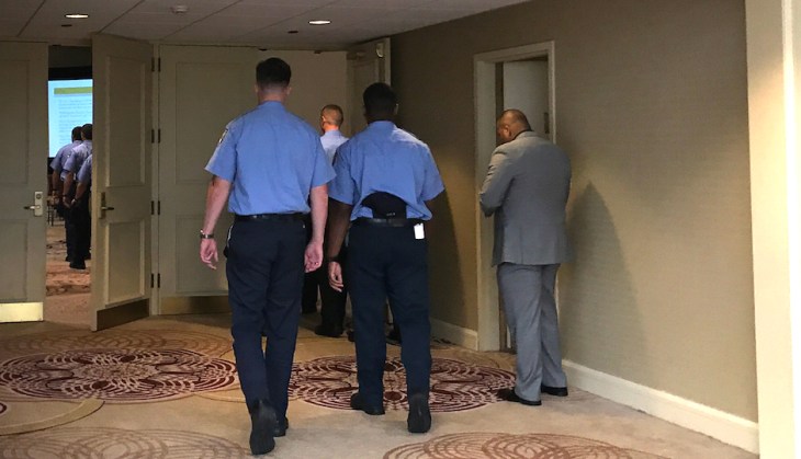 philadelphia-police-contract-negotiations-john-mcnesby Published on September 28, 2017 in State Legislature Considers Reforms for Police Collective BargainingFull resolution (940 × 540) Two Philadelphia police officers enter closed contract arbitration hearings. Courtesy of Samantha Holender/PhillyMag.