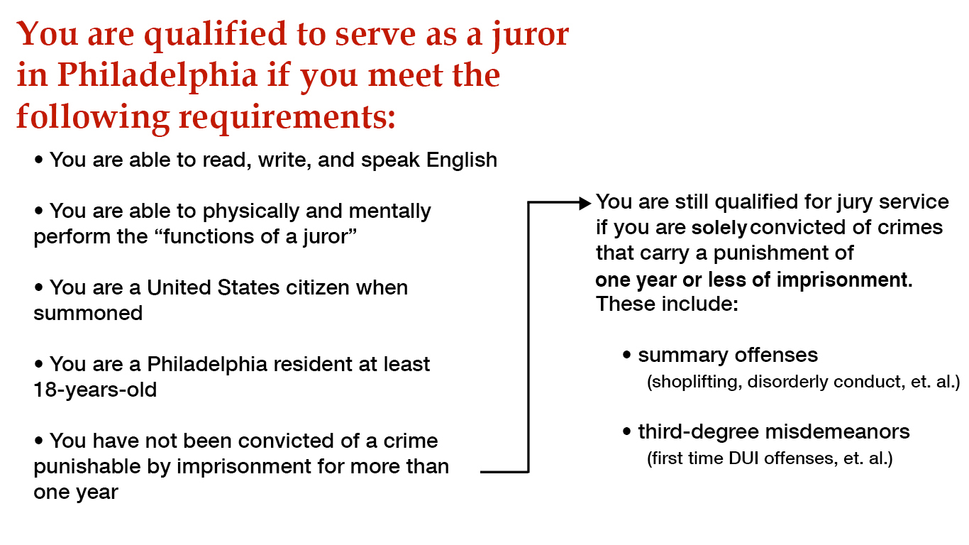 Pennsylvania sets out specific qualifications for jurors, which are available here. We have summarized those provisions in graphic form to enable you to determine if you are qualified.