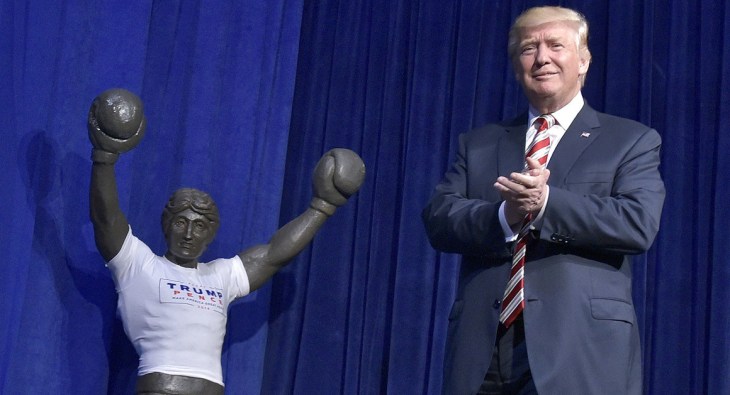 trump-rocky Published on March 16, 2018 in Few Trump Appointees Installed in Philadelphia PositionsFull resolution (1160 × 629) Donald Trump arrives on stage next to a statue of Rocky during a rally at the Sun Center Studios in Aston, Pennsylvania, on Sep. 22, 2017 / Courtesy of Getty